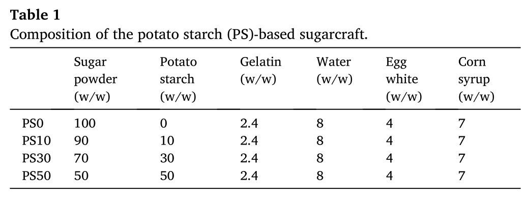 首先,制作用于3D打印的糖膏油墨。研究人员将糖粉和不同比例的马铃薯淀粉PS(0%、10%、30%和50%wt/wt)混合,分别标记为PS0、PS10、PS30和PS50。将明胶溶液、鸡蛋清、玉米糖浆加入到混合粉末中,揉捏10min,得到均匀的混合物。将混合物装入60mL注射器料筒中,4℃下密封存储24小时。配方组成如下表所示。