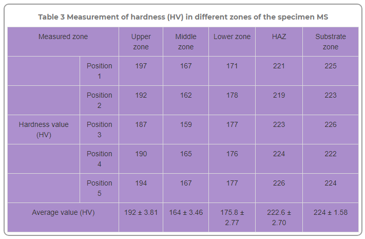 在五个不同区域观察到了样品的微观结构。上部区域具有三种类型的铁素体晶粒,并且热和高冷却速率的变化很大,具有垂直于基体分布的“具有主要奥氏体枝晶的层状结构”。中间区域有两种晶粒,主要特征是“铁素体的颗粒结构,在晶界处有少量的珠光体”。下部区域的冷却速度比上部区域慢的显微组织是由“均匀的铁素体晶粒组成的,其中分布着薄的薄片并与薄的珠光体条共存”。这些晶粒比中间区域的晶粒细,因为此处的热冲击值较高。在热影响区(HAZ)中,微观结构从奥氏体转变为马氏体,而基底区具有铁素体/珍珠岩带状微观结构–与中间区“相的均匀分布”完全相反。