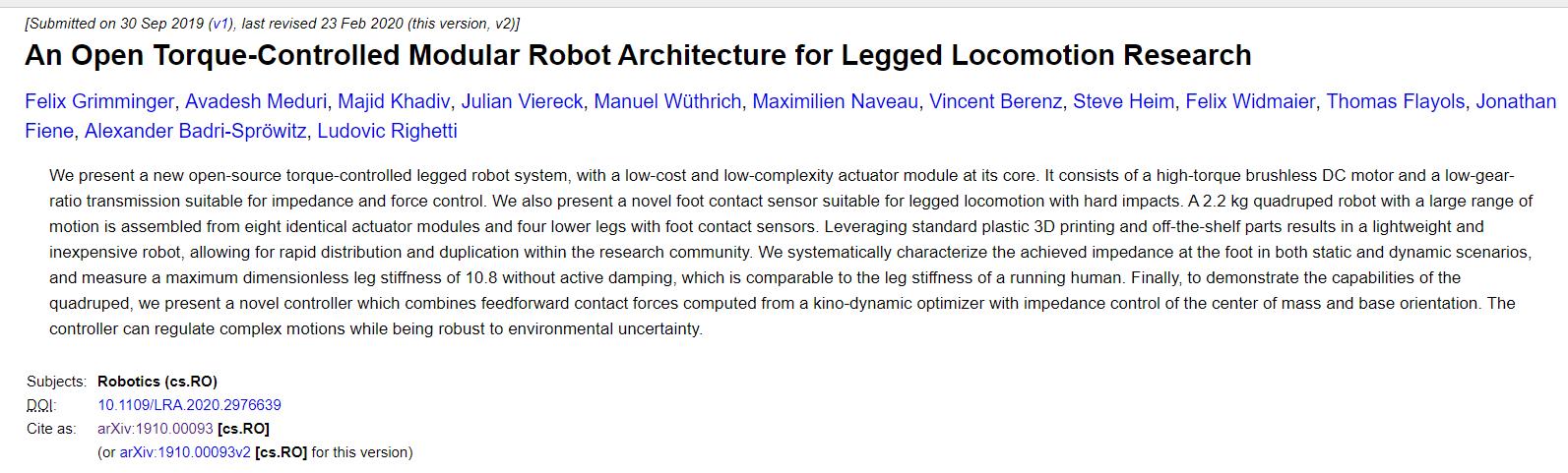 关于机器人开发模块的更多细节可以这篇论文中找到 "An Open Torque-Controlled Modular Robot Architecture for Legged Locomotion Research "。此外,该机器人的开源文件可以在项目的GitHub上找到。