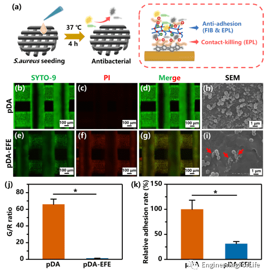 图4 LBL涂层HDPE支架抗菌实验。(a)体外抗菌实验示意图及原理。pDA (b-d)和pDA-EFE (e-g)支架上金黄色葡萄球菌活性的SYTO-9/PI分析(j)。附着在pDA (h)和pDA-EFE (i)支架上金黄色葡萄球菌的SEM图像(k)