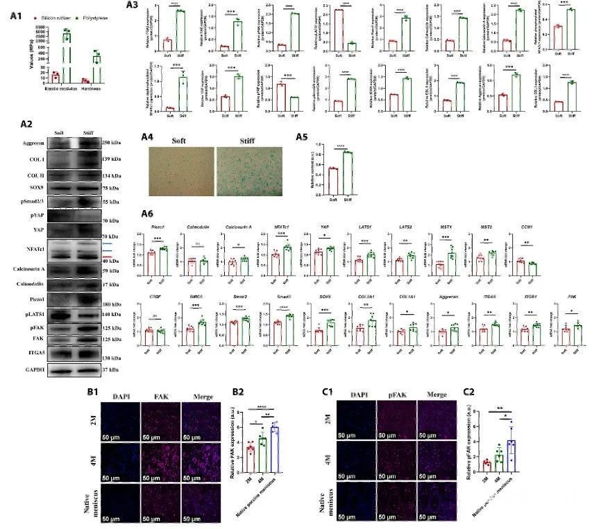 与术后2个月相比,PCL支架+滑膜移植组再生组织在术后4个月的机械性能明显增加。之前研究表明,基质硬度是影响YAP激活的另一个关键因素。研究人员假设基质硬度会影响YAP-pSmad2/3-SOX9轴。首先,为构建不同基质硬度条件,将人SMSCs接种到柔软的硅胶培养板或传统硬质聚苯乙烯培养板上。在硬质基质条件下培养后,YAP-pSmad2/3-SOX9轴被激活,YAP、pSmad2/3和SOX9表达上调,pYAP表达下调。人SMSCs表现出纤维软骨表型,COL I、COL II、凝集素和GAG表达上调。其次,先前研究表明Piezo1能感知基质的硬度。硬基质处理后,Piezo1的表达明显上调,随后下游钙调蛋白、钙调神经蛋白和去磷酸化NFATc1的表达也上调。因此,Piezo1可通过协同激活钙调蛋白和NFATc1来感知基质硬的程度,继而激活YAP-pSmad2/3-SOX9轴,促进人SMSCs生成纤维软骨。有综述表明,硬基质可通过整合素-FAK(局灶性粘附激酶)信号通路促进YAP的核转位和活化。本文研究发现发现整合素-FAK信号通路被显著激活,整合素α5(ITGA5)、FAK和磷酸化FAK(pFAK)表达上调。磷酸化LATS1则明显下调,导致YAP磷酸化减少。因此,硬质底物诱导的整合素-FAK信号激活抑制了Hippo信号转导,促进YAP的核转位和激活。最后,对PCL支架+滑膜移植组和原生猪半月板再生组织中FAK信号激活情况进行评估。再生细胞和原生猪半月板纤维软骨细胞FAK和pFAK表达明显升高。术后4个月时,再生细胞中FAK和pFAK的表达比术后2个月时有所增加。因此,以上结果表明,在半月板再生过程中,硬基质通过激活Piezo1和FAK信号调控YAP-pSmad2/3-SOX9轴发挥作用。