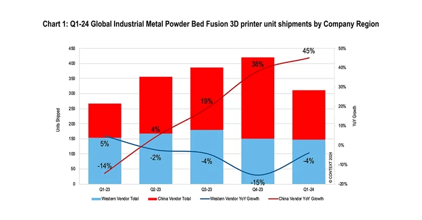 CONTEXT报告:2024一季度中国PBF金属3D打印机出货量猛增45%,四家公司排进全球前五
