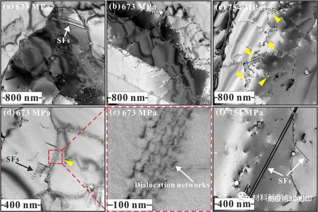 图4. 1050 ℃退火样品变形后的TEM明场照片。(a, b)位错亚结构如位错胞和位错条纹;(c-e)位错胞放大照片,包括致密位错网;(f)少量SFs。