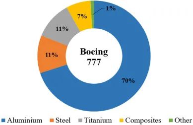 高强度轻量化铝合金已被航空航天公司广泛用于实现燃油效率和减轻飞机重量。例如,高强度轻量化铝合金AA2524-T3、AA7055-T77、AA7150-T77和AA2024-T3(机身结构)主要用于波音777,如图3所示。同样,由于在飞机结构中使用了AMed高强度轻量化铝合金部件,重量节省了20%,使得波音787梦幻客机的燃油效率提高了10-12%。2017年,波音公司的目标是在每架787梦想客机上使用1000个AMed组件,从而可能为每架飞机节省300万美元。
