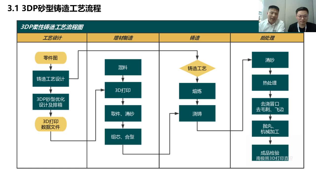 2023年5月8日,北京三帝科技联合欣鑫铸造作了一场线上报告,主题为“3DP砂型打印技术在绿色智能铸造中的应用实践”,报告由三帝科技产品技术副总赵浩博士和欣鑫铸造总经理谭大为主讲,南极熊对本场报告进行了直播。