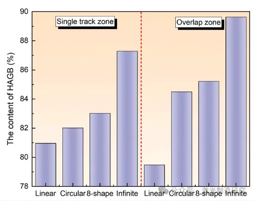 图 7. 不同振动的高角度晶粒边界 (HAGB) 含量。左侧区域为单轨区,右侧区域为重叠区。