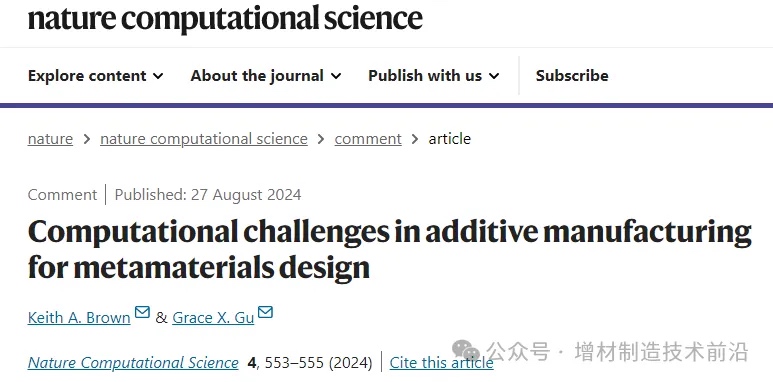 波士顿大学副教授Keith A. Brown于日前在nature computational science发表了“Computational challenges in additive manufacturing for metamaterials design”一文,深入探讨了超材料增材制造设计中的计算挑战。文章指出,3D打印在制造超材料方面发挥着关键作用,因为它能够精确控制几何形状和多尺度结构,从而实现所需的性能。然而,设计和预测增材制造超材料的行为却是一项复杂的任务。