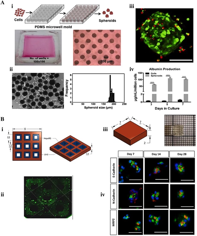 将肿瘤细胞封装在GelMA水凝胶中可以直接构建3D肿瘤模型,以探索肿瘤发展机制。近年来体外肝癌模型和肝芯片已成为动物模型的焦点和潜在替代品,有学者利用高通量微孔技术形成肝球体,以研究肝细胞活力(图1A),将HepG2 / C3A细胞封装在光交联GelMA水凝胶中,利用生物打印快速构建了大量的肝脏模型,可以精确调节包裹肝细胞的水凝胶外层厚度,并有助于进行长期的毒性评估(图 1B)。