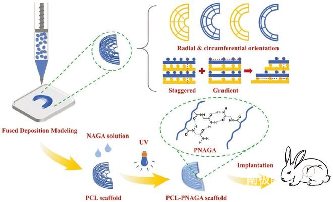 为了模拟微结构特征,并考虑到机械需求,研究者提出构建一个PNAGA缓冲3D打印PCL框架半月板替换物,它由径向和周向的PCL纤维组成,模仿天然半月板的胶原纤维网络,从而提供机械支持,特别是周向的抗拉能力,以及填充PCL框架的PNAGA水凝胶,以复制蛋白多糖抵抗轴向压缩载荷和提供缓冲的功能(方案1)。考虑到PCL结构的疏水性,对其进行碱预处理,以增加PCL与PNAGA的润湿性和表面接触面积。