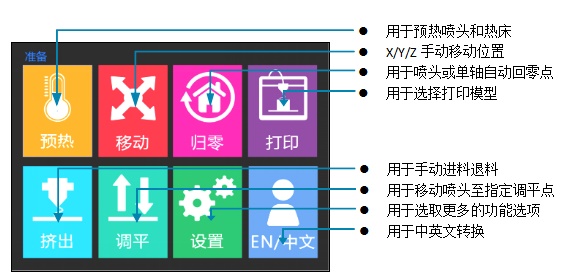 第一步:选择【预热】按键,进入预热菜单;选择预热【喷头】,运用 【+】或【-】按键,设置预热耗材相应的温度;(参考温度值:PLA≈200 ℃,ABS≈240 ℃);