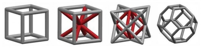 图3 具有立方对称性的晶胞:立方、体心立方,八角形桁架与四十二面体。