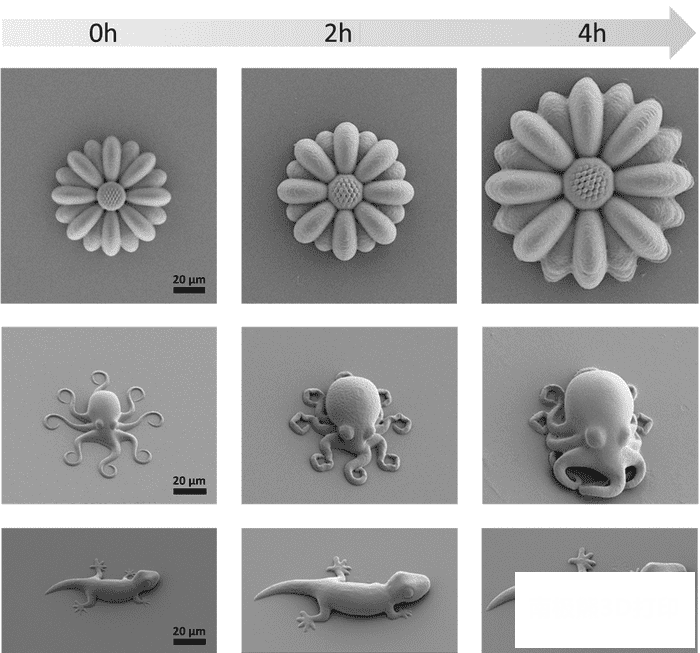 利用适应性材料,研究人员在后续研究中成功地生产出了更复杂的3D微结构,如壁虎、章鱼,甚至具有“生命”特性的向日葵。这些材料以动态化学键为基础。海德堡大学的研究人员报告说,烷氧胺特别适合于这一目的。在打印过程结束后,这些动态键使复杂的微观结构在短短几个小时内增长了8倍,并在保持形状的同时变硬。Blasco教授强调说:“传统油墨不具备这些特性。含有动态键的自适应材料在3D打印领域有着光明的未来。”