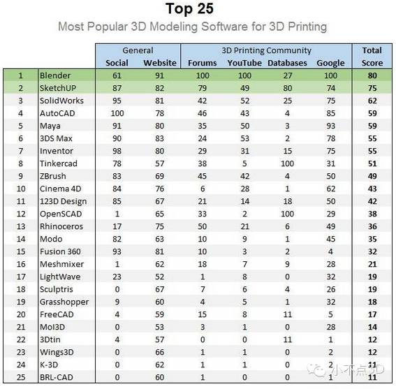 许多人可能会惊讶地看到,Sketch Up软件屈居第二,这款软件拥有非常友好的用户界面十分适合初学者,而且它在专业人员中的应用也很广泛,并在学校或者学生中间非常流行。“Sketch Up最近正在推动可3D打印对象的分享,因而未来它在“数据库”这一块得到的分数有可能进一步增加。”Materialise团队在其博客中说。