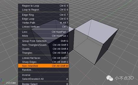 以Blender为例,有一个功能用来判断非流形(non-manifold)区域 ,我们可以在非流形立方体上试用下: