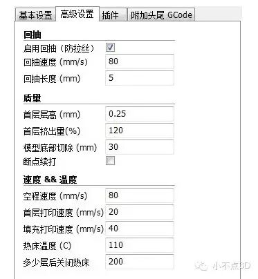 • 多少层后关闭热床 根据自己使用的实际状况决定。一般底板用美纹纸的话这个功能不使用,过早关闭热床会使模型与底板粘性变差。高级设置默认参数如右图: