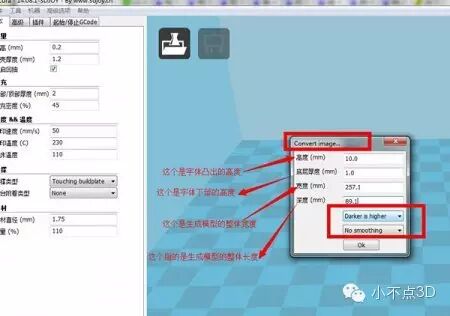 打开安装好的Cura软件,执行“文件”——“打开模型或Gcode…”,选中我们制作好的jpg格式图片。然后会弹出一个选项设置框“Convert image…”,在其中设置我们需要设定的各项参数即可。