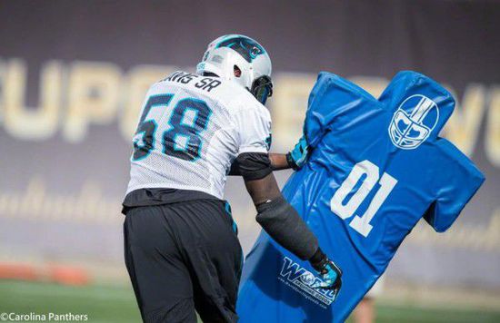Thomas Davis在准备超级碗的训练中带着3D打印的手臂夹板