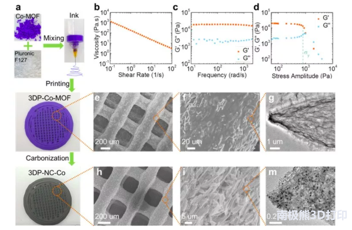 图2详细地展示了3D打印电极的简单制备流程,前躯体Co-MOF浆料的流变学参数,以及电极形貌与结构。该碳电极集合了分级多孔结构、高比表面、自支撑框架以及纳米催化剂等结构优势。其独特巧妙的技术路线,也为制备其它能源器件电极提供了新思路。该论文作者为: Zhiyang Lyu,* Gwendolyn J. H. Lim, Rui Guo, Zongkui Kou, Tingting Wang, Cao Guan, Jun Ding,* Wei Chen,* John Wang*