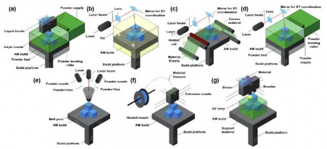 图3 3D打印技术的分类包括:(a) 粘结喷射,(b) 光聚合,(c) 板材层压,(d) 粉床熔融,(e) 定向能量沉积,(f) 材料挤出,和 (g) 材料喷射。