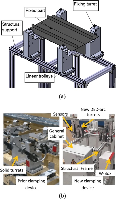 图 1用于固定航空部件的夹具炮塔位置 (a) CAD 示例,(b) 以前的夹具解决方案和新的拟议解决方案。