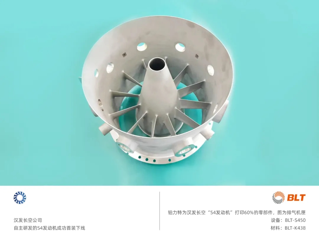 2025年9月29日,汉发长空公司近日正式宣布,其自主研发的S4发动机成功首装下线,该发动机在气动结构、燃烧技术方面均实现创新。铂力特使用BLT-S320、BLT-S450、BLT-S515、BLT-S615设备成功打印了该发动机60%的零部件,为发动机的研制提供了制造保障,以先进的增材制造解决方案,助力S4发动机提升性能、可靠性与轻量化水平。