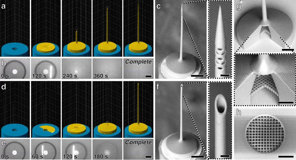 早期为了降低微注射失败率,人们尝试过通过洁净室微加工技术制造硅基侧孔针头。这些方法虽然实用,但成本高昂、劳动强度大,且几何形状受限。相比之下,esDLW工艺能够高速、灵活地生产具有集成功能的复杂几何形状针头,无需粘合剂、后处理或对准步骤。