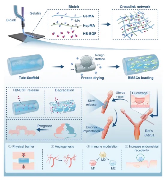 浙江大学贺永教授团队采用同轴3D打印技术开发了一种新型生物活性支架。该支架由明胶甲基丙烯酰(GelMA)-肝素甲基丙烯酰(HepMA)生物墨水构成,可通过静电作用结合肝素样表皮生长因子(HB-EGF)实现其可控释放。这一独特设计兼具双重功能:作为物理屏障预防损伤后粘连形成,同时作为生物活性递送系统通过促进新生血管化实现子宫内膜再生。研究进一步整合了骨髓间充质干细胞(BMSCs),通过将巨噬细胞极化为抗炎M2表型来调控局部免疫微环境。动物实验表明,该联合疗法能成功恢复子宫内膜容受性(表现为雌激素受体α(ERα)和孕激素受体(PR)表达恢复),最终在子宫损伤模型中实现妊娠成功。全面安全性评估证实了该疗法的治疗潜力。这种多功能支架通过同步解决子宫内膜修复的结构性、再生性和免疫性障碍,为宫腔粘连治疗提供了具有前景的新策略。相关工作以“Coaxial printing of slow-release heparin-binding epidermal growth factor scaffold to avoid the occurrence of intrauterine adhesions”为题发表在《Acta Biomaterialia》上。