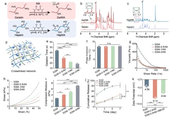 ¹H NMR证实GelMA和HepMA合成成功。以5wt% GelMA为基础,加入0.5-2wt% HepMA构建双交联网络。光流变显示HepMA加速凝胶化且保持打印性能。5GM-0.5HM模量(3.05±0.64 kPa)与子宫组织(2.85±0.12 kPa)最匹配。含HepMA组7天HB-EGF释放率(40%)显著低于纯5GM组(80%)。Zeta电位证实HepMA通过静电调控释放。最终选择5GM-0.5HM,满足力学匹配、打印适性和控释三大需求。