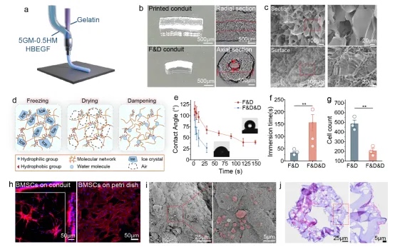 我们采用同轴打印技术制备明胶支架,尺寸匹配大鼠子宫。冷冻干燥后支架形成多孔结构但疏水性增强,经潮化处理(F&D&D)显著改善亲水性。接触角测试显示处理组液滴吸收时间远快于对照组。细胞接种实验证实F&D&D组细胞保留率更高。培养4天后,支架上BMSCs形成细胞簇并分泌胞外基质,SEM显示良好粘附和外泌体分泌,H&E染色表明多孔结构促进细胞附着和物质交换。