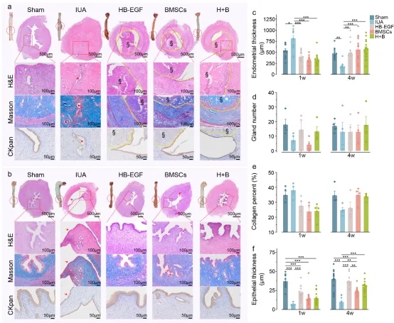 通过手术损伤大鼠子宫内膜基底层建立宫腔粘连(IUA)模型,评估负载HB-EGF、BMSCs及其联合治疗(H+B)的支架疗效。术后1周,IUA组出现致密粘连和上皮破坏,而治疗组通过支架物理隔离损伤面促进上皮再生。术后4周,IUA组发展为完全宫腔闭塞伴积液,而H+B组实现近乎正常的子宫修复,表现为单层上皮再生和纤维化消退。定量分析显示,联合治疗显著改善子宫内膜厚度、腺体数量和胶原沉积,优于单一治疗。结果表明,HB-EGF与BMSCs协同通过上皮保护和结构重建促进子宫内膜再生。