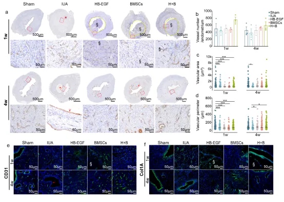血管生成是子宫内膜修复的关键。术后1周,H+B联合治疗组形成规则血管网,而单药组仅产生不成熟微血管(6.47μm)。4周后,治疗组完成修复,但IUA组仍存在异常血管分布的纤维束。免疫荧光显示IUA组早期Col1A沉积显著。