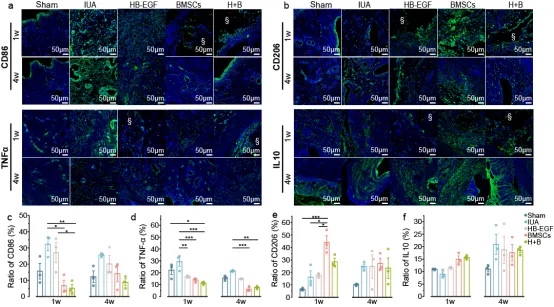 损伤后,巨噬细胞先分化为促炎M1型(CD86⁺/TNF-α⁺)清除坏死组织,后转为抗炎M2型(CD206⁺/IL-10⁺)促进修复。研究发现:术后1周,IUA组M1占主导,而BMSCs和H+B组显著增强M2极化。至4周时,BMSCs持续促进M2转化,形成促再生微环境,而IUA组仍以M1为主并伴随纤维化。证明BMSCs通过调控巨噬细胞极化改善子宫内膜修复。