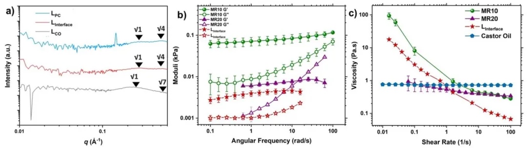通过小角X射线散射和流变测试的方法,研究了界面分离的三层材料(Lpc、Linterface、Lco)。结果表明,Lpc和Linterface为层状结构,Lco为六边形结构,所有层均表现出剪切稀化特性,与平衡脂质凝胶机械性能相似。