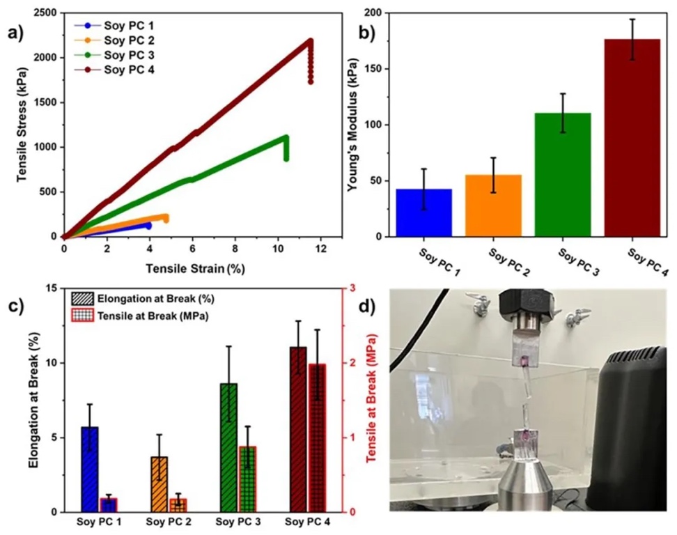 通过单轴拉伸实验的方法,研究了不同PEGDA含量的纤维机械性能。结果表明,PEGDA含量越高,纤维的杨氏模量、拉伸强度和断裂伸长率越高,其中Soy PC 4的杨氏模量达30.5 kPa。