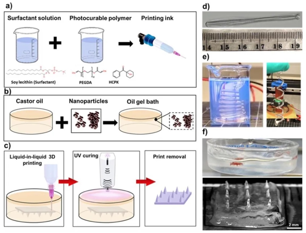 通过设计打印流程和构造模型的方法,研究了脂质水凝胶在液液3D打印中的成型过程,包括纤维、基底和微针贴片的制备。结果表明,该技术能成功构建复杂3D结构,可用于拉伸测试、细胞活性检测及药物输送等场景。