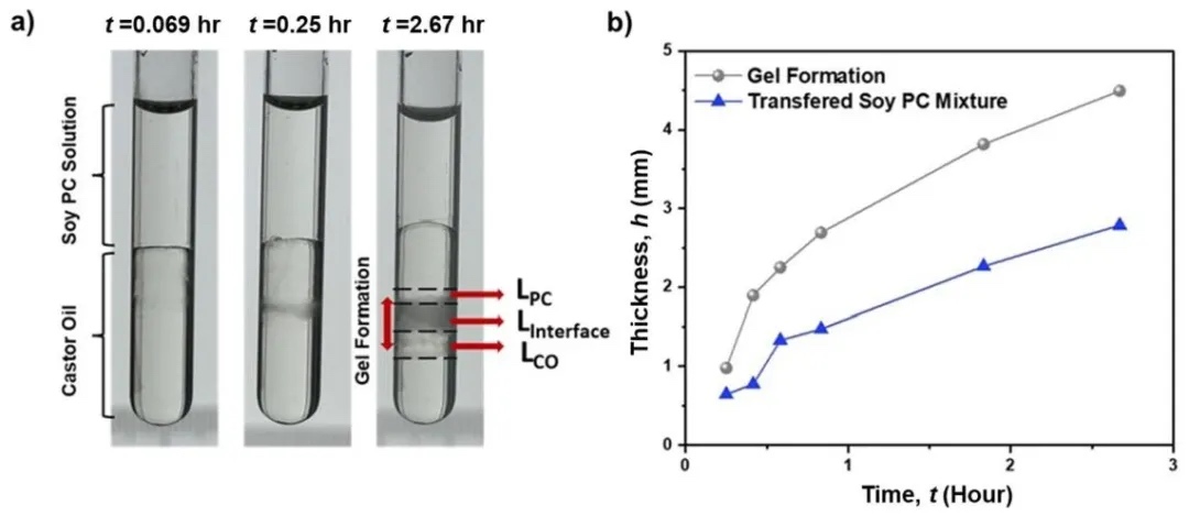 通过定时观察和厚度测量的方法,研究了蓖麻油与大豆PC溶液界面的凝胶化过程。结果表明,界面处形成三层结构(大豆PC富集层、界面凝胶层、蓖麻油富集层),凝胶厚度和大豆PC转移量随时间增加,证实脂质自组装驱动凝胶形成。