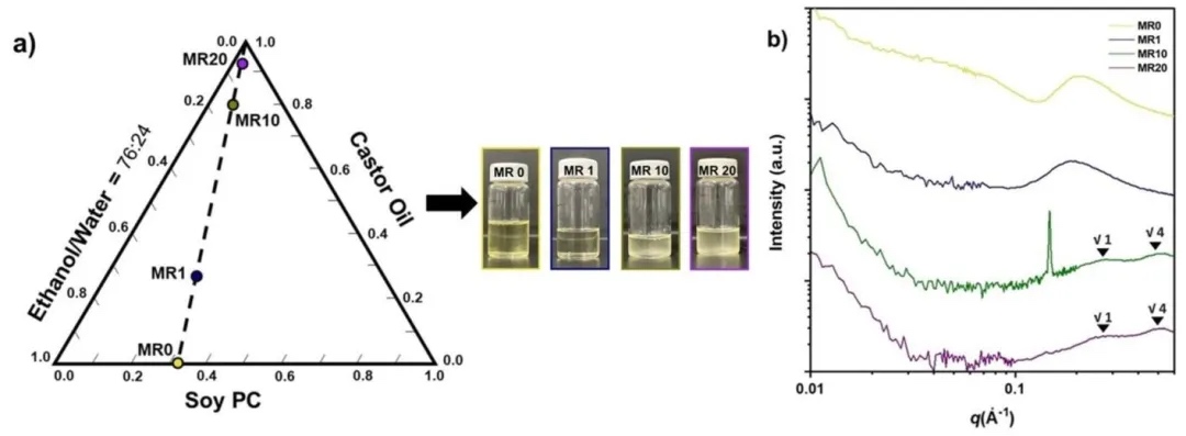 通过绘制相图和小角X射线散射测量的方法,研究了不同蓖麻油与大豆PC摩尔比的平衡脂质凝胶。结果表明,高摩尔比样品呈现层状纳米结构,域间距随蓖麻油含量增加而减小,证实脂质自组装形成有序结构。