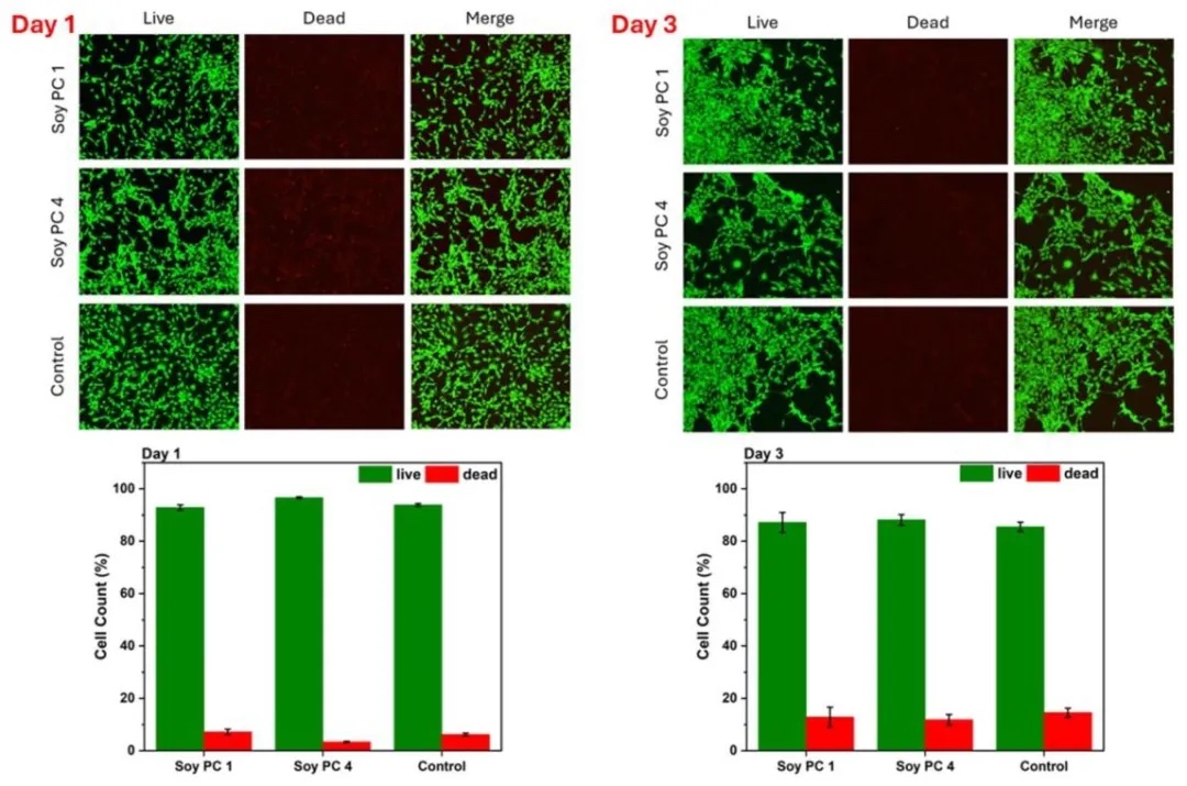 通过活/死染色和细胞计数的方法,研究了Soy PC 1和4样品的细胞毒性。结果表明,两种样品的细胞存活率均超过80%,与对照组无显著差异,证实材料无毒性,但PEGDA表面缺乏细胞结合位点,直接接触时细胞黏附性低。