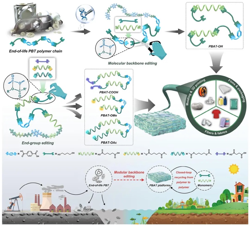 工程聚酯聚对苯二甲酸丁二醇酯(PBT)应用广泛,但退役PBT因回收手段有限,面临资源浪费与环境污染问题。传统机械回收会导致分子链断裂、性能下降,化学回收存在流程复杂且成本高于原生原料等瓶颈。化学与精细化工广东省实验室蔡秋泉副研究员、浙江理工大学张洪杰特聘研究员和浙江大学朱蔚璞教授等人受分子生物学DNA编辑技术启发,提出模块化分子编辑策略,通过羟基-酯交换与端基修饰反应,将废弃PBT直接转化为高性能、可3D打印的聚己二酸-对苯二甲酸丁二醇酯(PBAT)平台材料,解决了传统回收路径的效率与成本痛点。相关工作以《Modular Molecular Editing of End-of-Life PBT for High-Performance Sustainable and 3D-Printable Platforms》为题发表在《Advanced Materials》上。