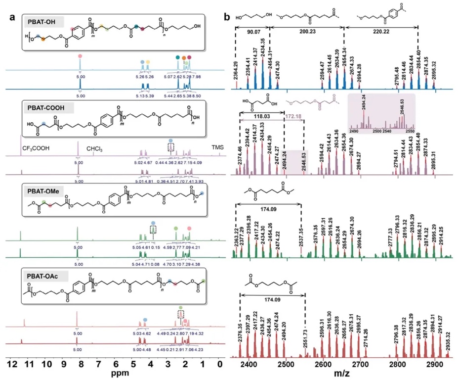 2. 不同端基PBAT的核磁共振(NMR)与基质辅助激光解吸电离飞行时间质谱(MALDI-TOF-MS)验证图,通过1H NMR光谱和MALDI-TOF-MS分析的研究方法,研究了PBAT-OH、PBAT-COOH、PBAT-OMe和PBAT-OAc的端基结构。结果显示,PBAT-COOH的羧基端基在2.79 ppm处有特征峰,MALDI-TOF-MS证实各端基的分子链终止单元(如羟基对应90.07 Da重复单元),验证了端基编辑的准确性。