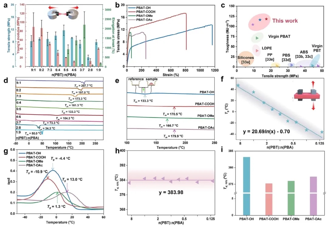 3. 可编程PBAT的机械与热性能表征图,通过拉伸测试、差示扫描量热法(DSC)、动态力学分析(DMA)及热重分析(TGA)的研究方法,研究了不同主链组成(n(PBT):n(PBA))和端基类型PBAT的性能。结果表明,PBAT拉伸强度最高达17.34 MPa,玻璃化转变温度(Tg)与n(PBT):n(PBA)呈对数线性关系(Tg = 20.69 ln[n(PBT):n(PBA)] − 0.70),端基修饰可使热分解温度波动8℃。
