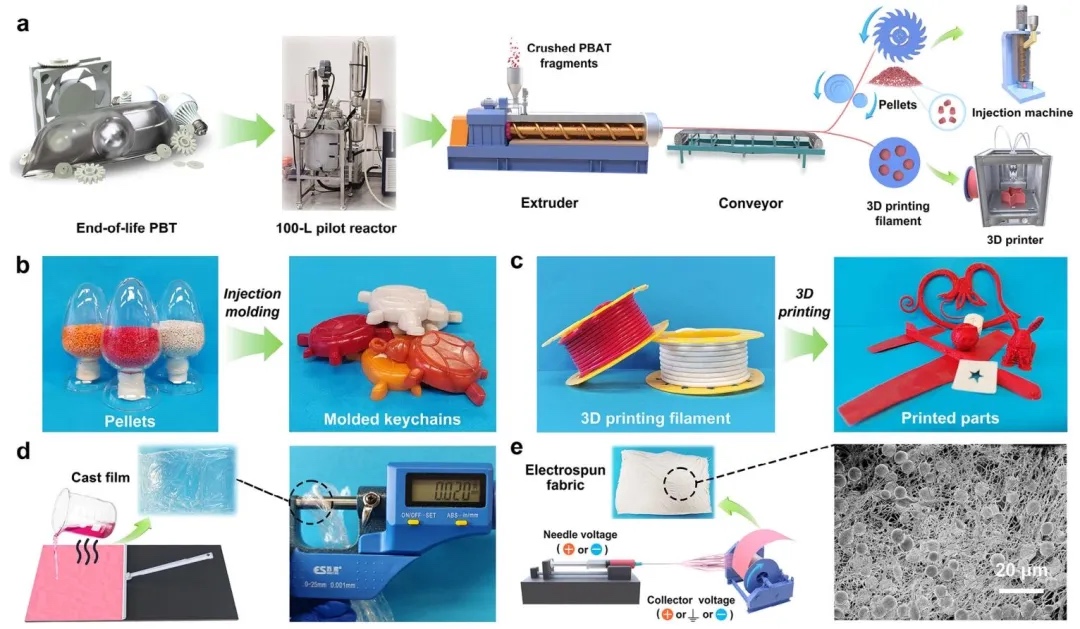 4. 废弃PBT转化PBAT的应用场景示意图,通过挤出造粒、3D打印、溶液成膜及静电纺丝的研究方法,研究了PBAT在注射成型、3D打印、薄膜和纤维领域的应用。结果显示,PBAT可制备0.02 mm透明薄膜及直径约10 μm的电纺纤维,3D打印 filament直径达1.75 mm,成功制备钥匙链等成型制品。
