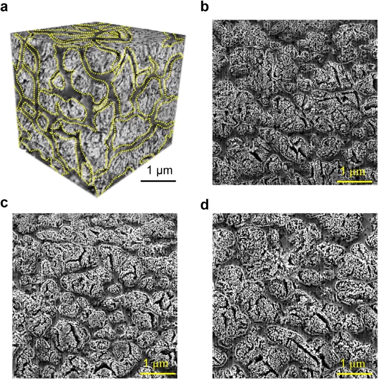图2展示了去合金后的“土楼式”三维微结构。a图是通过2500张FIB-SEM图像重构得到的三维体,黄虚线代表不可去合金化的富Cu骨架相,展示了其在微米尺度上的三维互连特征。b–d分别是该立方体的左侧、后侧和底部表面切片的显微结构视图,进一步证明了骨架相将纳米多孔铜基体分隔为类似“分舱”的结构。