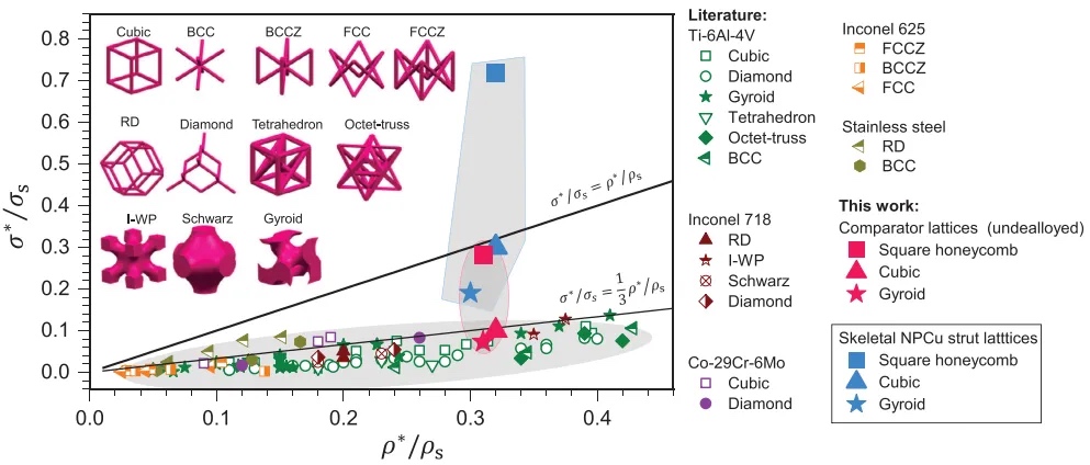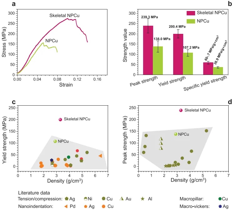 总结:本研究以“客家土楼”的建筑理念为灵感,提出并实现了一种全新的骨架纳米多孔铜设计。 研究团队通过增材制造结合选择性去合金化工艺,在材料内部同时构筑了不可去合金化的富Cu骨架与纳米多孔基体,形成了独特的“骨架–分舱”层级结构。系统表征结果表明,这种结构能够有效抑制韧带粗化、显著提升材料的承载能力。实验测试显示,骨架纳米多孔铜的屈服强度和峰值强度分别比无骨架结构提升62%和70%,比强度超过60 MPa·cm³·g⁻¹,性能不仅优于传统纳米多孔金属,也超越了部分经过特殊设计的多孔体系。进一步在点阵尺度的验证中,骨架纳米多孔铜点阵的强度较对照组提高了2.4–3.1倍,甚至突破了Gibson–Ashby模型的经验极限,实现了轻质、高强、多功能兼得。这一成果不仅解决了纳米多孔金属“高孔隙率–低强度”的长期难题,也为开发兼具功能性与结构承载能力的新型轻质材料提供了新思路。