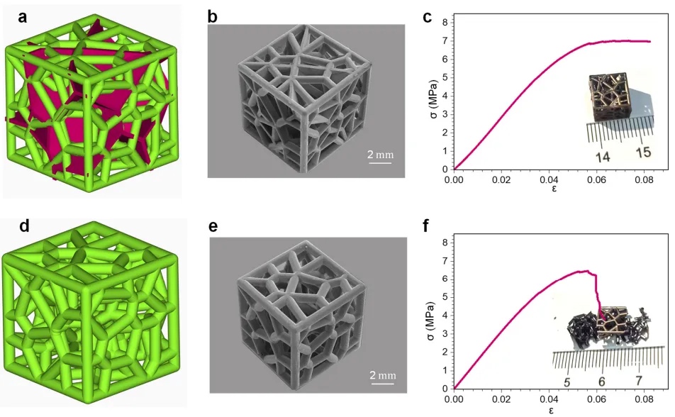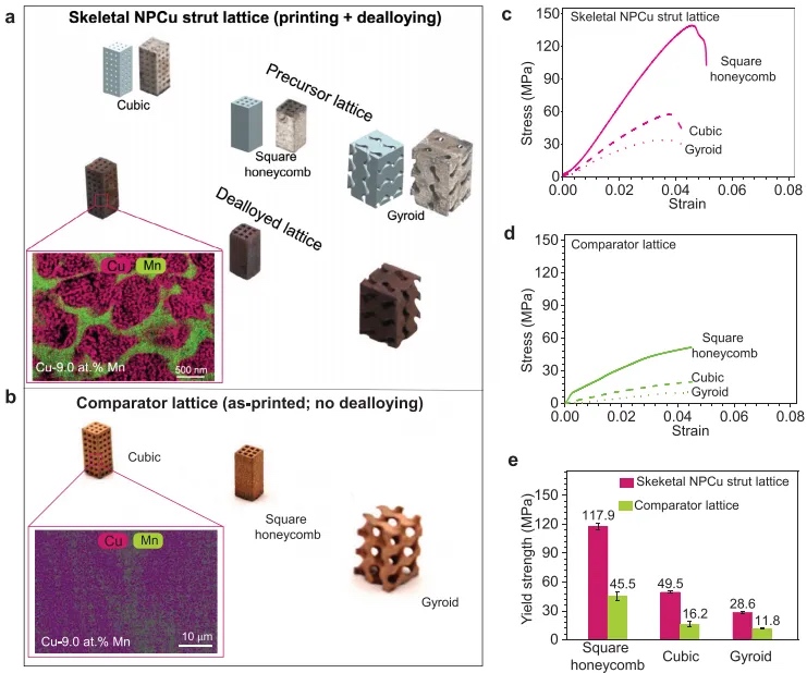 图5呈现了骨架纳米多孔铜在宏观点阵结构中的力学性能优势。a图给出了样品的CAD设计图和实际制备后的实物照片,可以看到通过增材制造与选择性去合金工艺相结合,研究团队成功构筑了带有骨架–纳米孔层级结构的点阵结构。局部放大的显微图进一步揭示了骨架相与纳米韧带共同存在的层级特征。c–d图对比了两类点阵在单轴压缩下的应力–应变响应。尽管两者在变形模式上类似,但带骨架点阵的强度表现出显著优势,其屈服强度比对照点阵高出2.4–3.1 倍,说明骨架在提升宏观承载能力方面发挥了关键作用。e图进一步总结了各类点阵的强度差异,其中由骨架纳米多孔铜构成的正方形蜂窝点阵表现尤为突出,其强度不仅比理论模型高出800%,比强度更是超过了对应的致密 Cu–Mn合金。