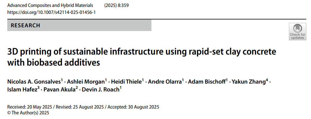 这项研究以题为“3D printing of sustainableinfrastructure using rapid-set clay concrete with biobased additives”的论文发表在《先进复合材料和混合材料》杂志上,由俄勒冈州立大学的德文·罗奇(Devin Roach)、尼古拉斯·贡萨尔维斯(Nicolas Gonsalves)等人联合撰写。项目得到了美国农业部、俄勒冈州立大学全球大麻创新中心和工程学院的支持。