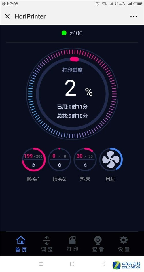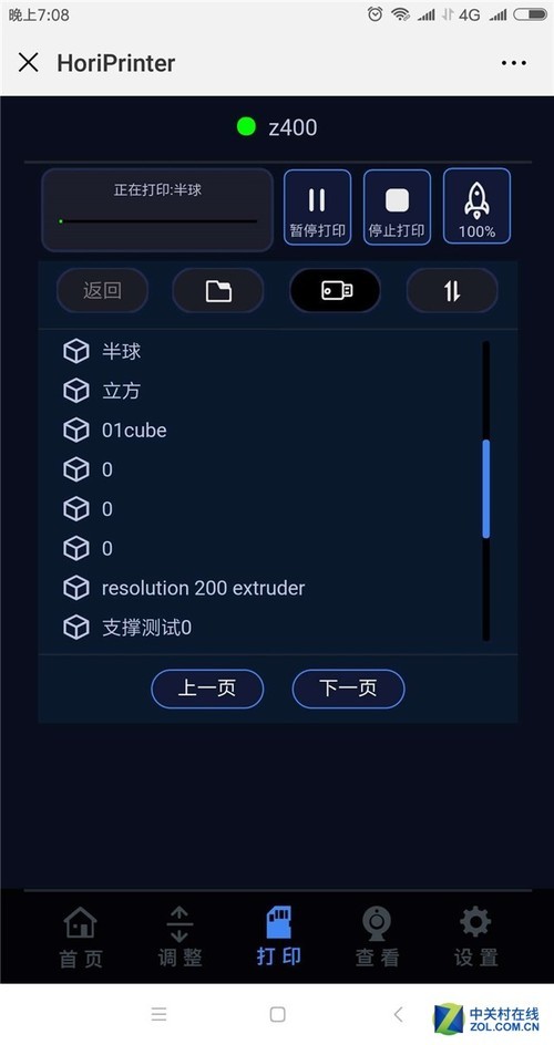 进入“远程控制”界面,操作界面和弘瑞Z400触摸屏相似,分为首页、调整、打印和设置,不同之处在于多了“查看”页面——弘瑞Z400内置摄像头,又支持网络连接,在PC、笔记本电脑、手机等多种终端上都可以监控打印进程,使打印过程始终处于可控状态下,提升打印成功率。