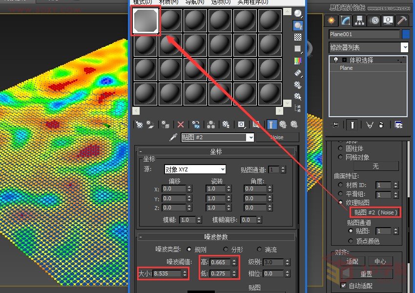 4.在曲面特征中选择纹理贴图,并为其添加噪波贴图。(使用贴图来随机控制选择)