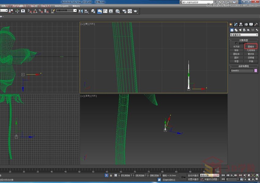17.准备制作花刺,在顶视图中创建圆锥体(Cone)。(下图)
