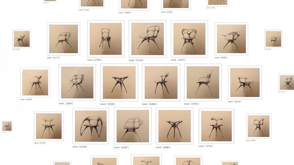 本项目以“Seed 6143”为名,旨在探索人工智能与设计师协同创新的潜力。合作团队首先以Lovegrove Studio的丰富草图库为基础,训练Google DeepMind的AI模型。通过文本提示和多轮迭代,AI生成了数百种兼具仿生美学和功能性的椅子设计方案。值得一提的是,团队刻意规避传统“椅子”标签,采用同义词及富有创意的描述,激发了模型对形式与语义的多维探索。